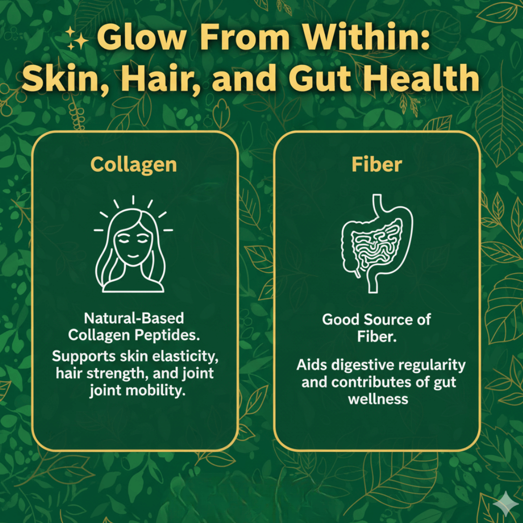 | β¨ Skin & Hair Vitality | Promotes radiant skin, stronger hair, and joint comfort | Natural-Based Collagen Peptides β Supports skin elasticity and hair strength |