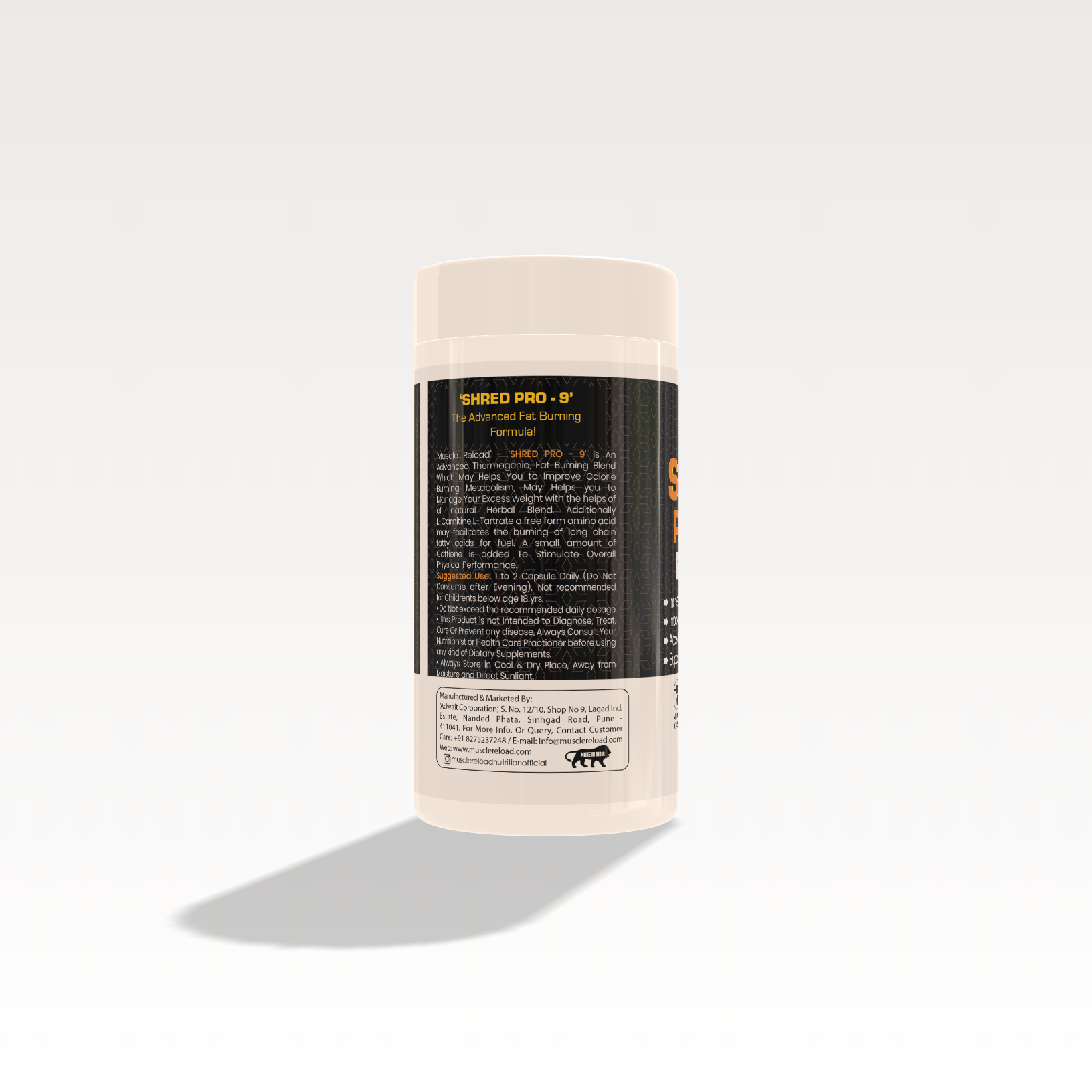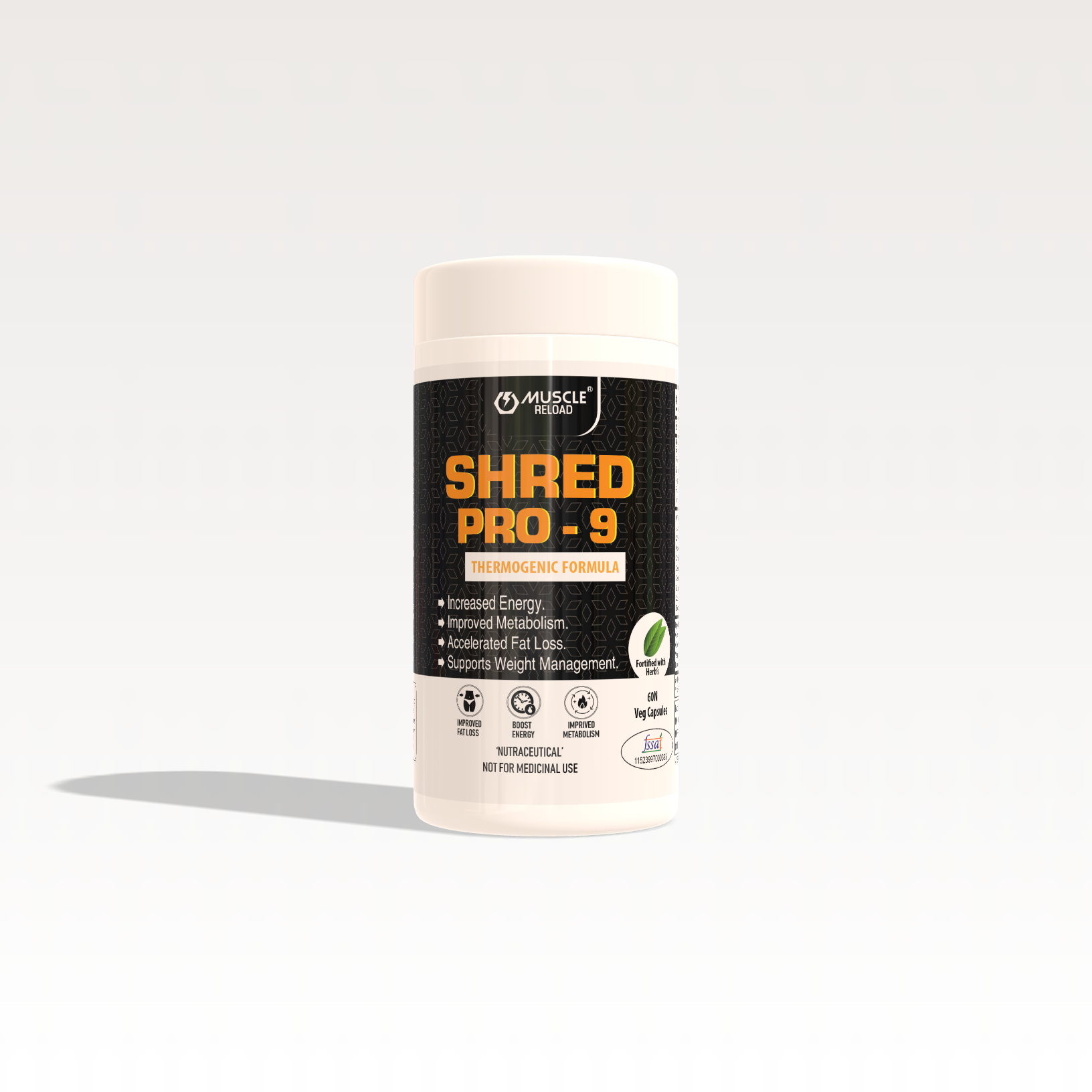 SHRED PRO - 9 is a scientifically formulated thermogenic fat burner designed to boost metabolism, enhance energy levels, and support weight management. Powered by 9 potent ingredients, it helps you burn stubborn fat, improve workout performance, and stay energized throughout the day.